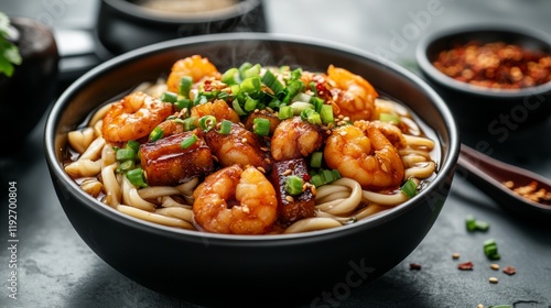 A bowl of hot udon noodles in a mild dashi soup, garnished with crispy tempura shrimp, kamaboko fish cake, and fresh green onions.