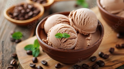A bowl of ice cream with a green leaf on top. The bowl is brown and has a wooden base