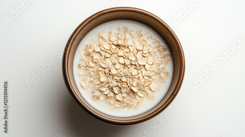 A bowl of muesli with milk, seen from a high angle