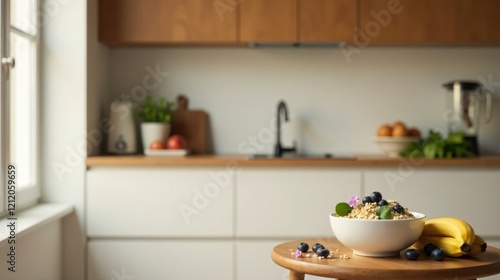 A bowl of oatmeal topped with blueberries and a sprig, accompanied by ripe bananas, sits on a wooden kitchen table, blurred kitchen background