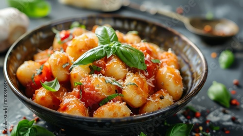A bowl of pasta with a garnish and some herbs