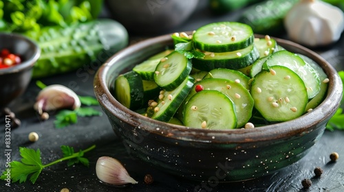 A bowl of pickled cucumbers placed on a table, ready to serve.