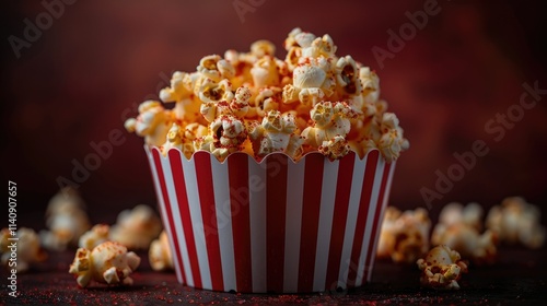 A bowl of popcorn with a red and white striped design, perfect for movie nights.