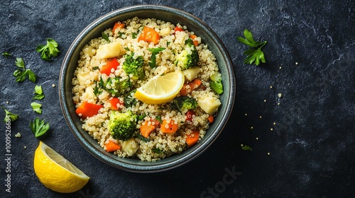 A bowl of quinoa and roasted vegetables, lightly drizzled with lemon, styled against a dark slate background for a healthy, low-fat diet concept