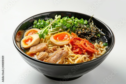 A bowl of ramen with meat and vegetables