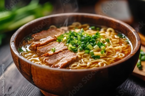 A bowl of ramen with noodles, meat and green onions, served in a wooden bowl, ai