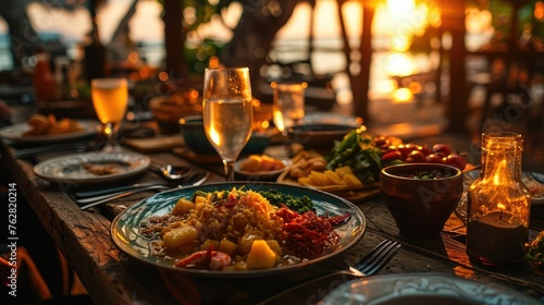A bowl of rice and seafood in a restaurant by the seashore. Thai cuisine.