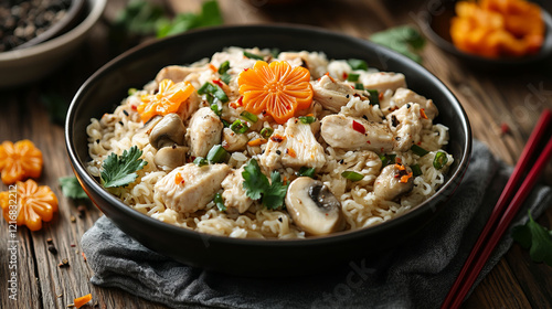 A bowl of rice noodles garnished with chicken, shiitake mushrooms, and carved orange chrysanthemums sits on a wooden table. Red chopsticks enhance the simple, festive composition.