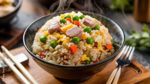 A bowl of rice with meat and vegetables is on a wooden table. The bowl is black and the rice is white. The rice is mixed with meat and vegetables, including carrots and peas