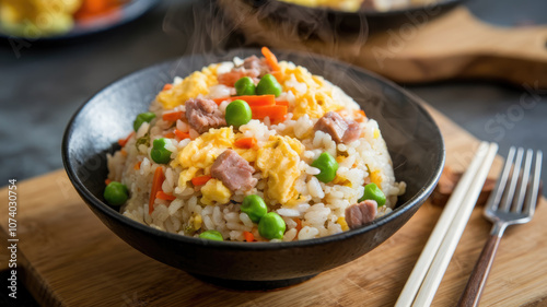 A bowl of rice with meat and vegetables sits on a wooden table. The bowl is filled with rice and meat, and there are several pieces of broccoli and carrots scattered throughout the dish