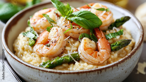 A bowl of rich, creamy risotto with shrimp and asparagus, garnished with a sprinkle of parmesan cheese and fresh basil.