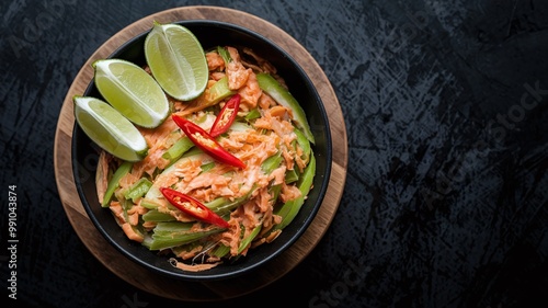 A bowl of salmon with green peppers, chili peppers, and lime wedges.