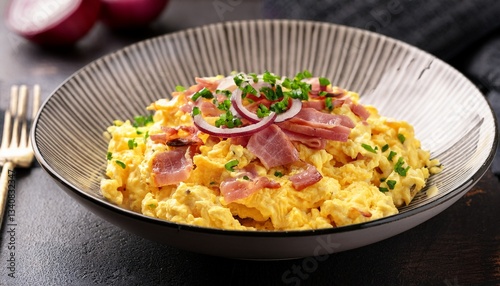 a bowl of scrambled eggs with ham and onions