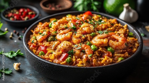 A bowl of shrimp and rice with vegetables