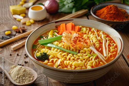 A bowl of spicy noodle soup with vegetables and seafood