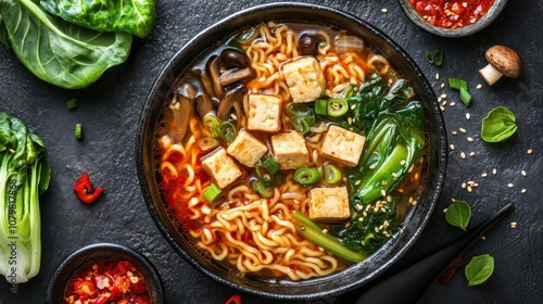 A bowl of spicy ramen with tofu, mushrooms, and greens. This photo can be used for food blogs, cooking websites, or recipe books.