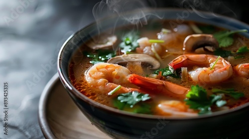 A bowl of spicy tom yum soup with shrimp, mushrooms, and lemongrass, steaming hot and ready to eat.