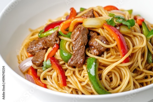 A bowl of steaming hot noodles served with sliced beef and colorful peppers