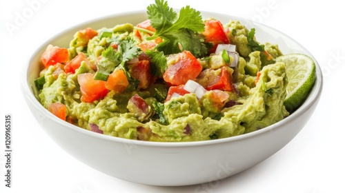 A bowl of tangy guacamole with mashed avocado, diced tomatoes, onions