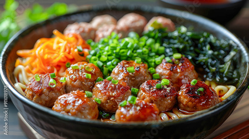 A bowl of traditional Japanese udon noodles topped with crispy meatballs, vegetables, and green onions