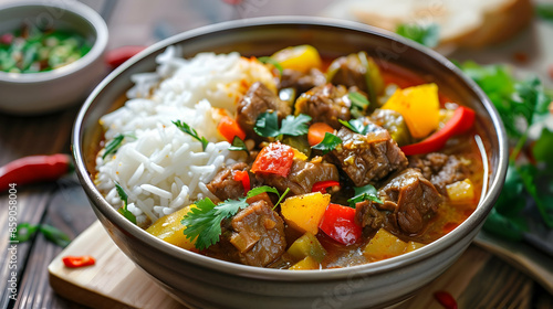 A bowl of vibrant, spicy curry with chunks of tender meat and colorful vegetables, garnished with fresh herbs and served with a side of fluffy white rice, against a warm, inviting background