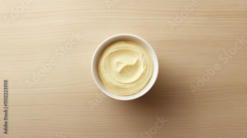 A bowl of yellow cream on a wooden surface