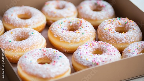 A box of doughnuts, dusted with icing sugar and decorated with sprinkles, ready to satisfy any sweet tooth.