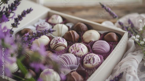 A box of luxury lavender chocolates, each piece intricately designed, with a displayed on a beautiful porcelain dish