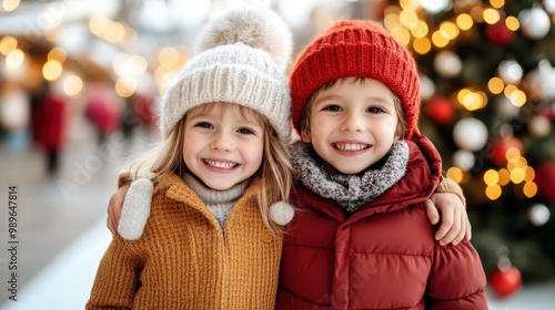 A boy and a girl dressed warmly in winter coats and hats stand close together, smiling broadly, with a festive background, symbolizing the joy of the season.
