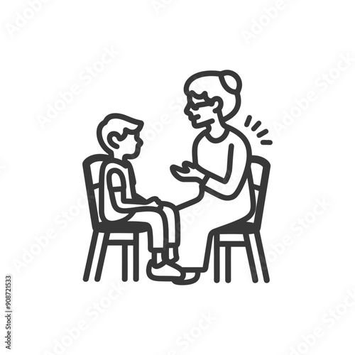 A boy and a woman sitting on chairs, facing each other in conversation.