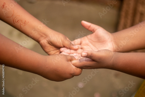 A boy holds the fingers of another boy with his hands and the background is blurred behind them