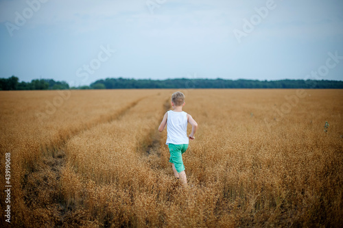 a boy in a white T-shirt and green shorts runs across a field of ripe wheat