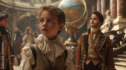 A boy in period costume stands in a grand hall, looking up in wonder at the globe.