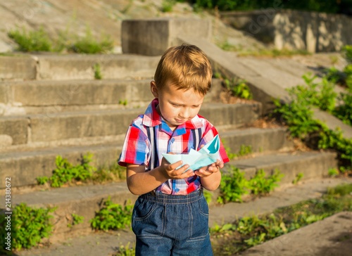 A boy in shorts is holding a paper boat in his hands