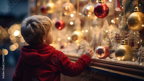 a boy is looking into Christmas decorated shop windows, the city, New Year's lights and garlands of the city, celebrating Christmas