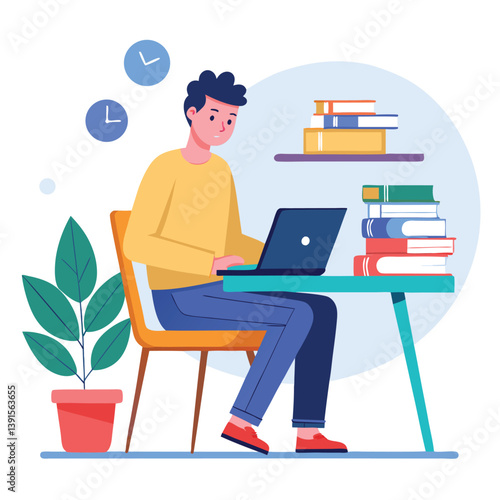 a boy is using his laptop vector