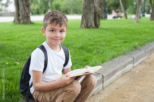 a boy of European appearance in a white t shirt with a backpack reads a book in the Park