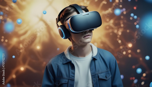 A boy wearing VR headset user. Surreal world and virtual reality. AI artificial intelligence man wearing VR glasses virtual global world internet connection and new experience in the future metaverse