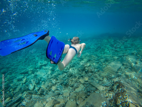 A boy with blue fins snorkeling in the blue sea under the rocky sea bottom.