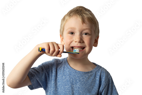 a boy with white hair holds a toothbrush in his hands wants to brush his teeth. White background.