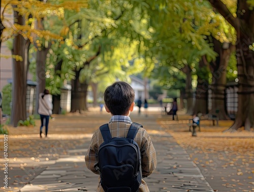 A Boy's Autumn Walk Through a Ginkgo-Lined Path