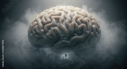 A brain shaped like a maze, with a small figure trying to find their way out through fog and noise