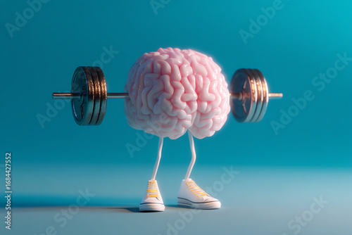 A brain with legs and sneakers lifts a barbell, symbolizing mental strength and cognitive fitness against a blue background