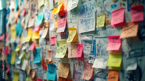 a brainstorming wall covered in colorful post-it notes and sketches of charts, illustrating the chaotic yet exciting nature of generating new business ideas