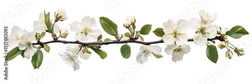 A branch adorned with delicate white blossoms and green leaves. Png, Transparent background.