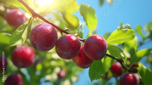 A branch full of ripe plums, with a bright blue sky in the background.