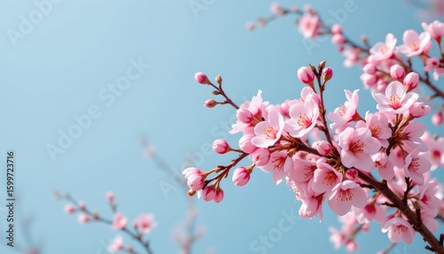 a branch of cherry blossoms set against a clear blue sky. the focus is on the vibrant pink flowers blooming in full springtime glory.