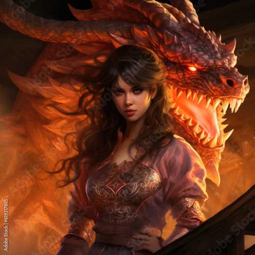 A brave heroine stands tall next to a fierce dragon, embodying courage and the spirit of adventure. AI generated