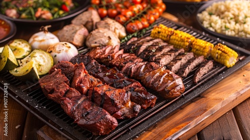A Brazilian churrasco barbecue with grilled meats, vegetables, and lively atmosphere