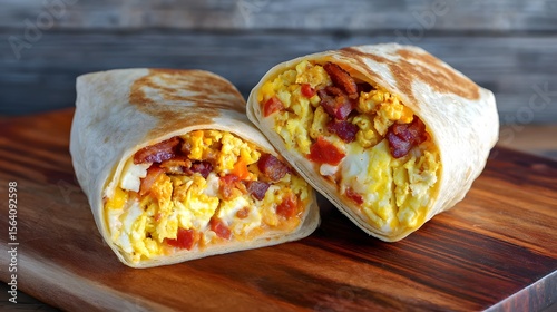 A breakfast burrito cut in half on a wooden board with eggs and bacon inside it